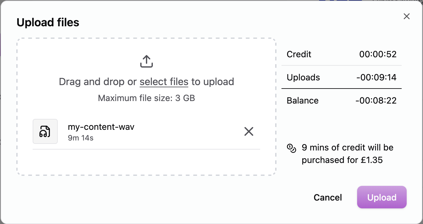 Your currently available credit, total upload duration, and future balance will be displayed (formatted as HH:MM:SS). If you do not have enough credit to cover your uploads, credit will automatically be added and the cost of this will be displayed.